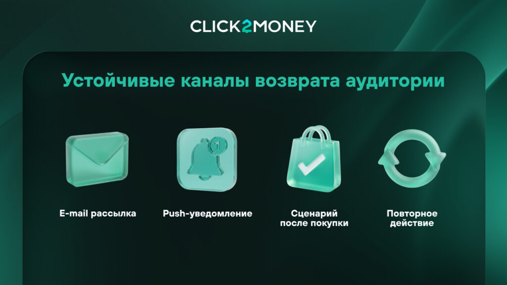 Самыми устойчивыми остаются собственные каналы возврата. Это email, push-уведомления и сценарии после покупки. Их преимущество в том, что они меньше зависят от платного привлечения и от колебаний стоимости трафика. Если бренд уже получил контакт пользователя и выстроил прямой канал связи, он может возвращать клиента не только через рекламу, но и через собственную систему коммуникации. Возможность повторно обращаться к уже известной аудитории через собственные данные отдельно поддерживается и рекламными платформами, и отраслевыми исследованиями.