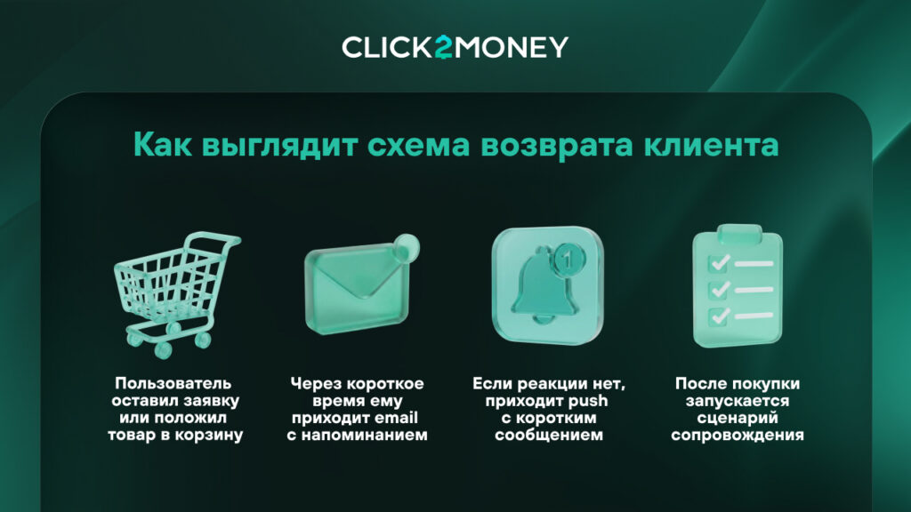 Такая схема работает лучше разовых касаний, потому что она учитывает реальный путь человека и не пытается решить все одной точкой контакта. Именно так возврат клиентов превращается из случайной реакции в управляемый процесс.