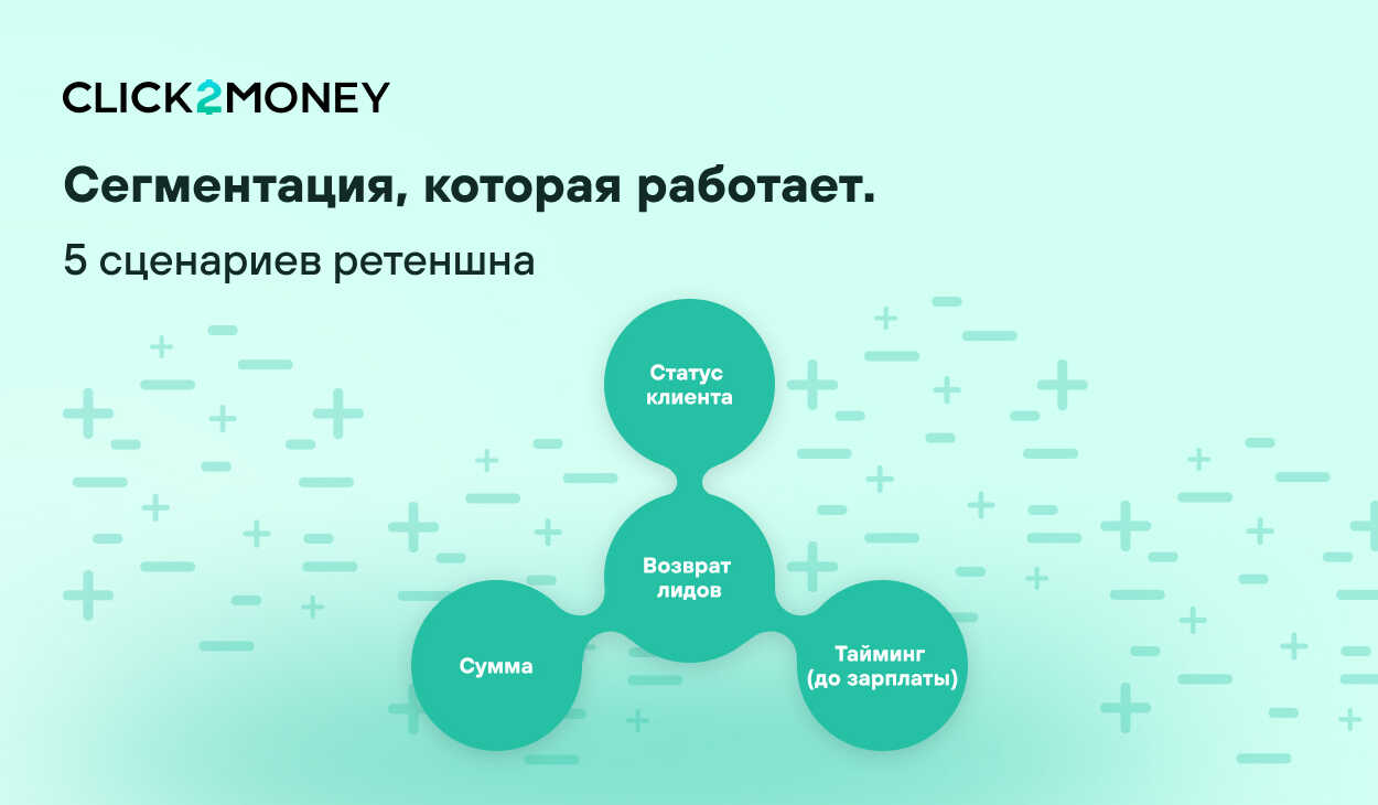 Чтобы эффективно возвращать лидов, используются email- и SMS-воронки – серии сообщений, которые автоматически рассылаются пользователям по заданным правилам. В финансовой вертикали такие воронки строятся с учетом сегментации аудитории по статусу клиента, по параметрам займа (например, сумма или тип займа) и по жизненным событиям (например, время до ближайшей зарплаты). Подходящий сценарий коммуникации определяется поведением пользователя: на каком этапе он находится и какая рассылка будет наиболее релевантна.