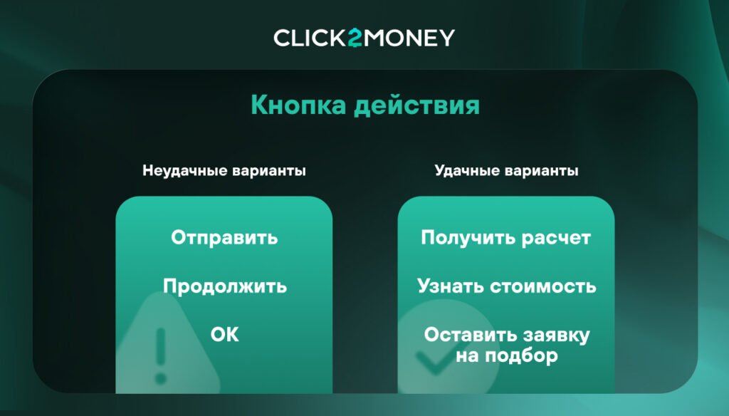 Именно эти элементы помогают посетителю перейти от увиденной рекламы к целевому действию. Пользователь приходит на страницу с определенным ожиданием, а микротекст либо подтверждает его, либо разрушает. Если в объявлении обещали быстрый расчет, а на странице человек видит непонятную форму и кнопку «Отправить», возникает несоответствие между сообщением в рекламе и тем, что пользователь получает после клика.