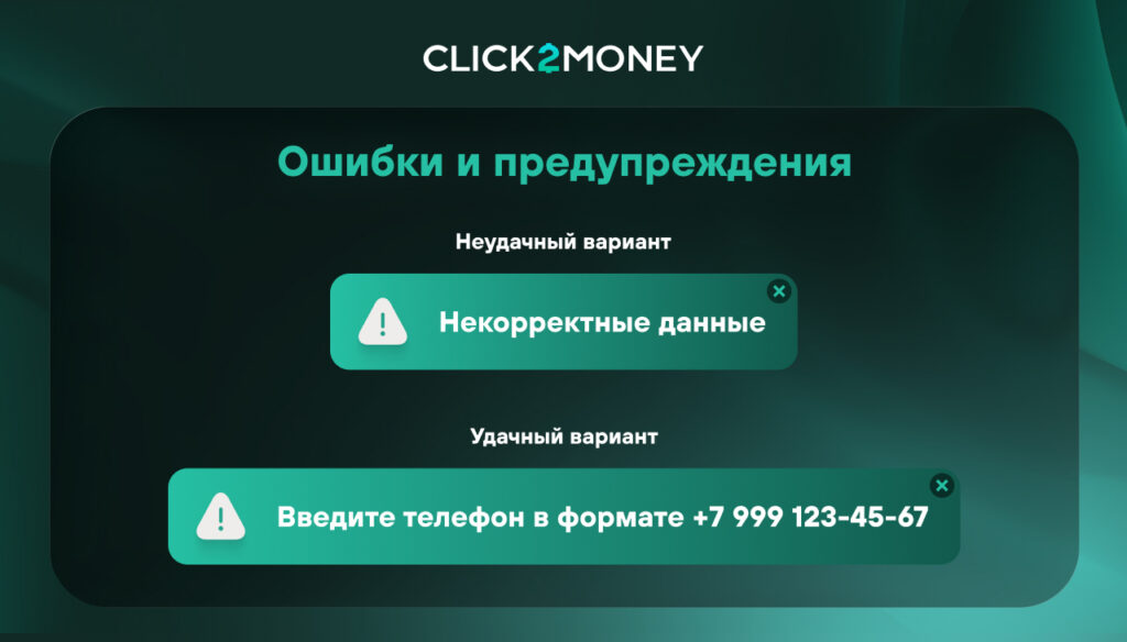 Человек должен видеть не просто факт ошибки, а способ ее исправить. Это делает форму более понятной и снижает число отказов.